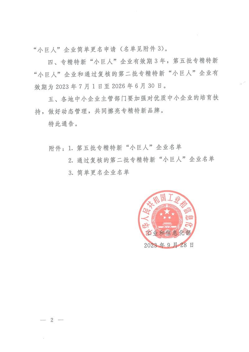 為貫徹習近平總書記關于“激發(fā)涌現(xiàn)更多專精特新中小企業(yè)”的重要指示精神,落實黨的二十大決策部署,工業(yè)和信息化部啟動了第五批專精特新“小巨人”企業(yè)審核的工作,我公司榮獲第五批專精特新“小巨人”稱號。